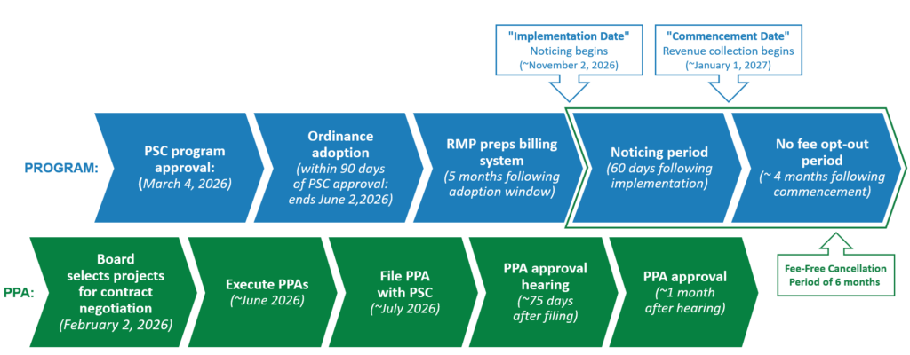 The Community Renewable Energy Program marks a significant and exciting step toward community-driven clean energy adoption!  The opportunity is now firmly in local hands. If you would like more information about how you can get involved and reach out to your city council members about this opportunity, see this page, organized by some of our grassroots partners. (see a graphic of the estimated timeline from the Community Renewable Energy Agency below)